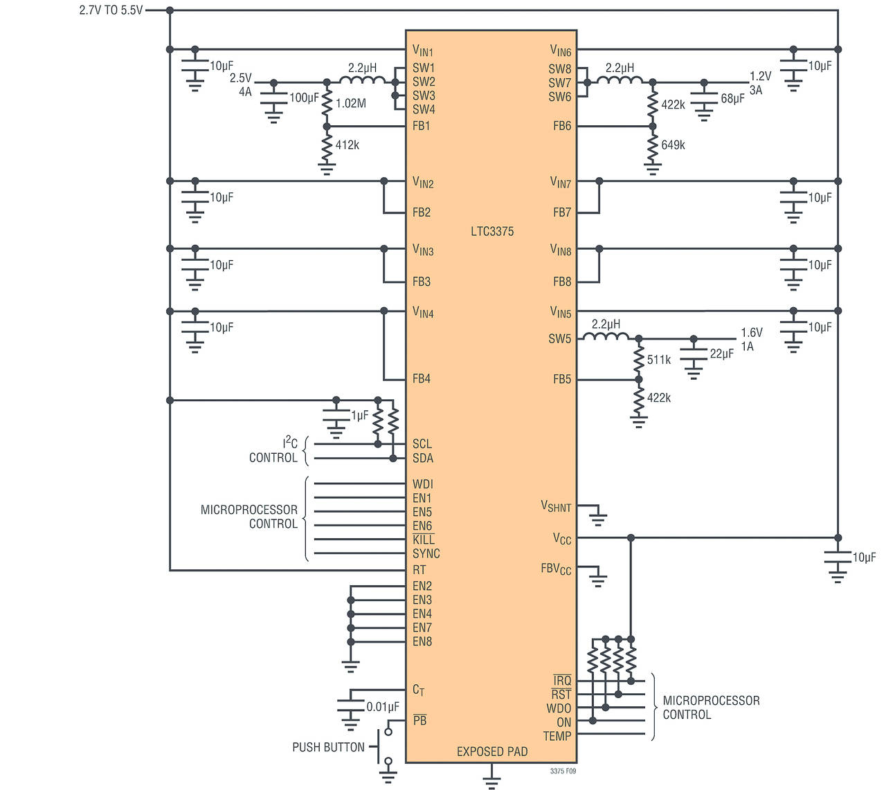 Un altro problema per l’elettronica nel settore automotive è costituito dalle drastiche variazioni della tensione della batteria, che scende a circa 5V durante l’avviamento a freddo, o da picchi di alta tensione. I circuiti elettronici non solo devono resistere a queste notevoli variazioni di tensione, ma devono anche continuare a funzionare. L’LTC3375 è dotato di un controller a pulsante e un regolatore esterno a Fet passante utilizzabili per ridurre un’alta tensione e quindi applicare all’LTC3375 una tensione regolata a un valore di sicurezza.