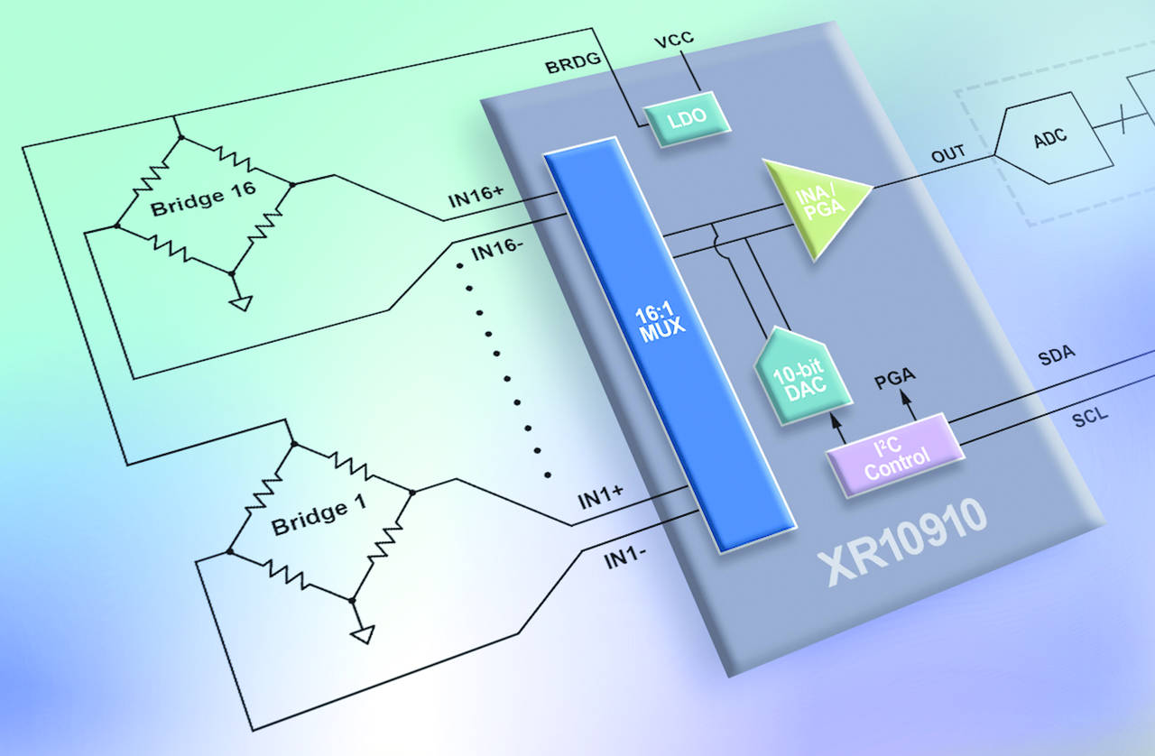 Parecchi sensori di forza e pressione utilizzano un elemento resistivo configurato sotto forma di circuito a ponte di Wheatstone spesso indicato con il nome di estensimetro (strain gauge). Gli elementi resistivi del ponte variano la loro resistenza in risposta a sollecitazioni meccaniche. I sensori estensimetrici sono utilizzati solitamente per misure sia di forza sia di pressione. XR10910 è un'interfaccia per il condizionamento dei segnali posto tra più sensori in configurazione a ponte e una Mcu con convertitore A/D o un Fpga. I sensori a ponte hanno un segnale di uscita differenziale (VO+ e VO-). In linea teorica, l'uscita di un ponte non caricato è pari a zero (VO+ e VO- sono identici). In ogni caso, valori poco precisi delle resistenze danno origine a una differenza tra VO+ e VO-. Questa tensione di offset del ponte può essere di notevole entità e variare tra i diversi sensori provocando una diminuzione dell'accuratezza del sistema. XR10910 permette di calibrare l'offset del ponte per ciascuno dei 16 sensori mediante il convertitore A/D presente a bordo.