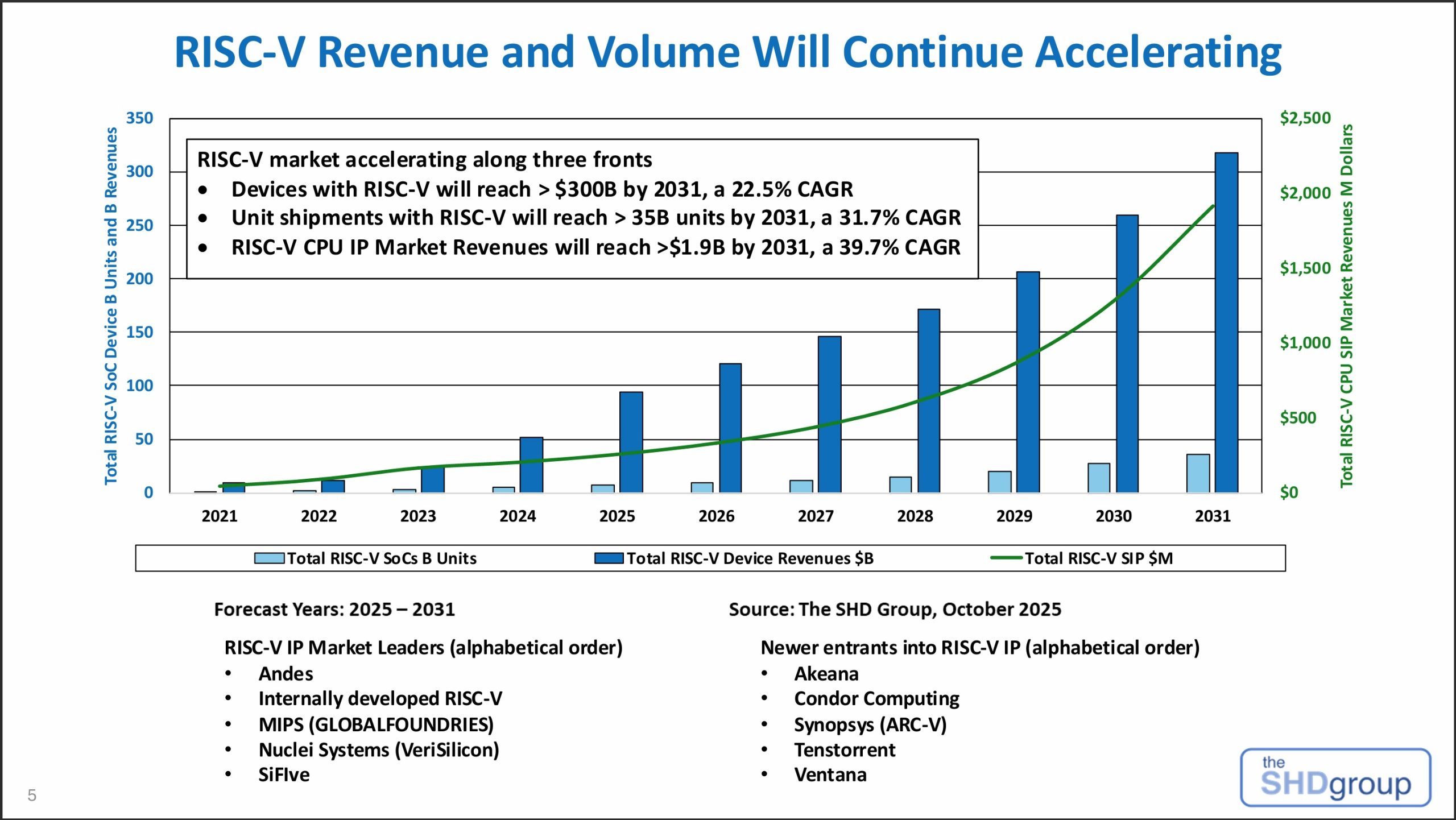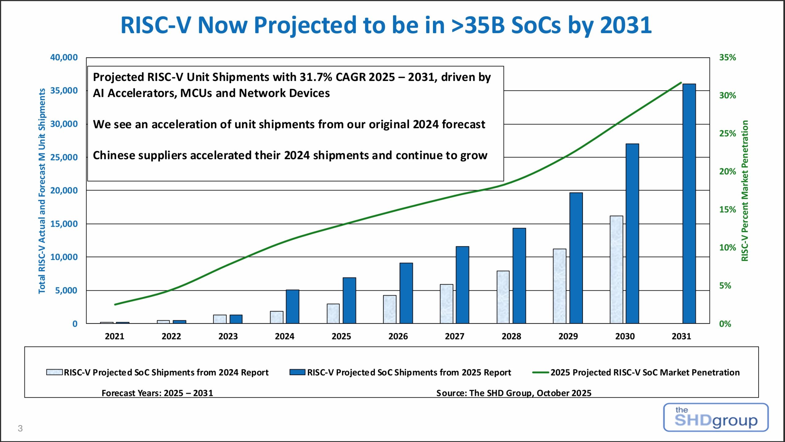 Stando alle ultime stime presentate al RISC-V Summit dalla società di ricerche di mercato The SHD Group, quest’anno l’architettura RISC-V è andata davvero oltre sestessa. Rispetto alle previsioni sulle spedizioni di SoC (system-on-chip) RISC-V calcolate nel rapporto 2024 stilato dagli analisti, le previsioni su tali spedizioni che compaiono nel rapporto 2025 mostrano performance molto migliori. In altre parole, la tecnologia RISC-V sta crescendo oltre le aspettative, ha spiegato Richard Wawrzyniak, principal analyst, per ASIC, SoC e IP, in The SHD Group. Al punto che ora la società prevede spedizioni per oltre 35 miliardi di unità SoC RISC-V entro il 2031, e un trend di crescita che registrerà un CAGR (tasso annuo di crescita composto) pari al 31,7% (2025 – 2031), guidato da acceleratori AI, MCU (microcontroller unit) e dispositivi di rete. La ragione di questa accelerazione nelle spedizioni di unità rispetto alla previsione originaria del 2024, chiarisce Wawrzyniak, è che i fornitori cinesi nel 2024 hanno aumentato le loro consegne, e continuano a crescere.